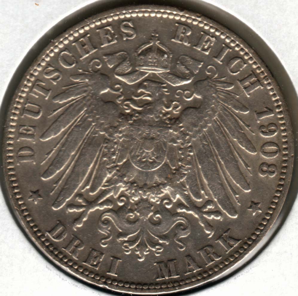 3 Mark (silver) 1908A 527 germ08.jpg (119513 bytes) germ08x.jpg (78517 bytes)   VF 18.00