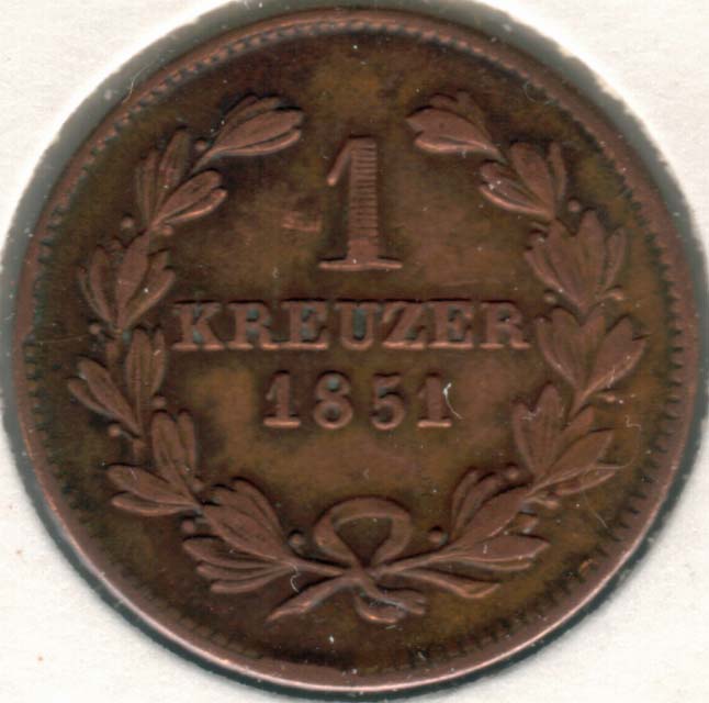1 Kreuzer 1851 218.2 ger5111t.jpg (66828 bytes) ger5111tx.jpg (61227 bytes)   VF 3.50