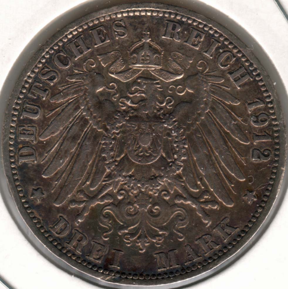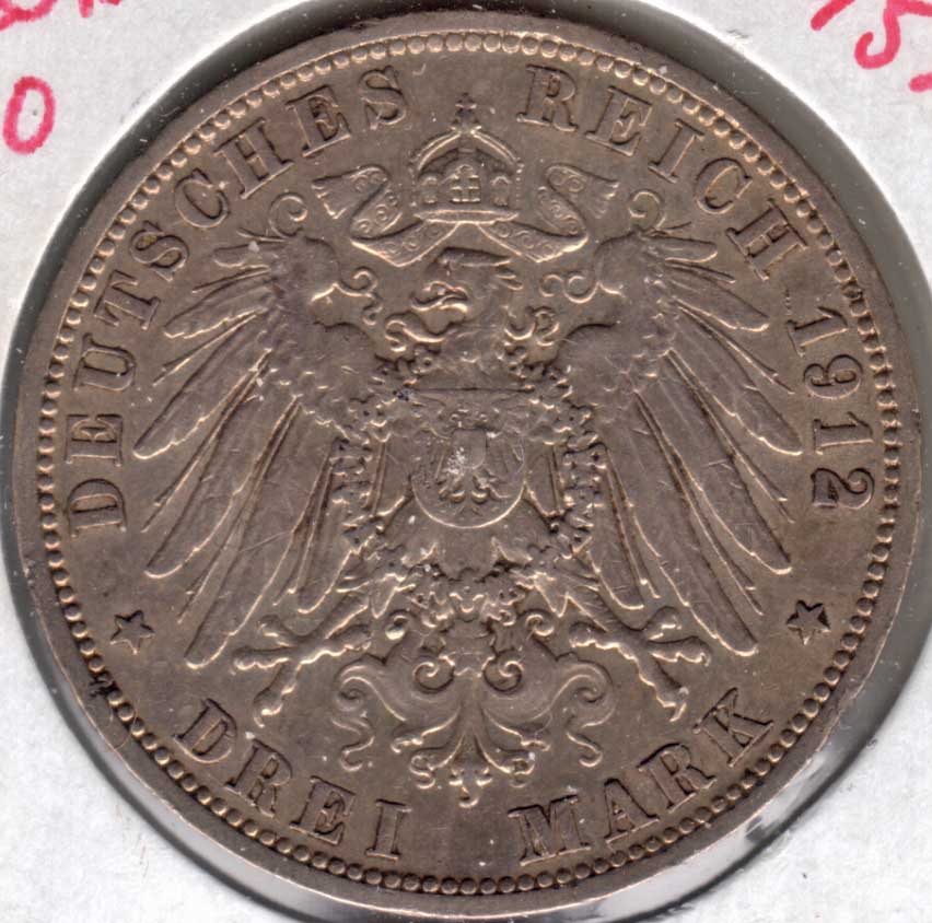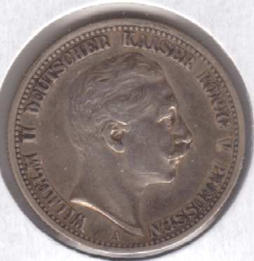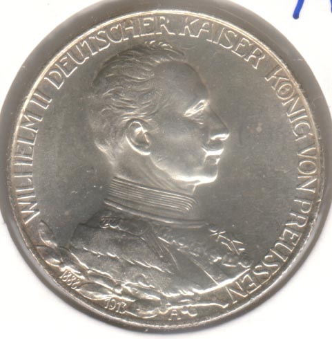 3 Mark (silver) 1912A 527ger8t9.jpg (117632 bytes) ger8t9x.jpg (75075 bytes)   VF/GVF 20.00