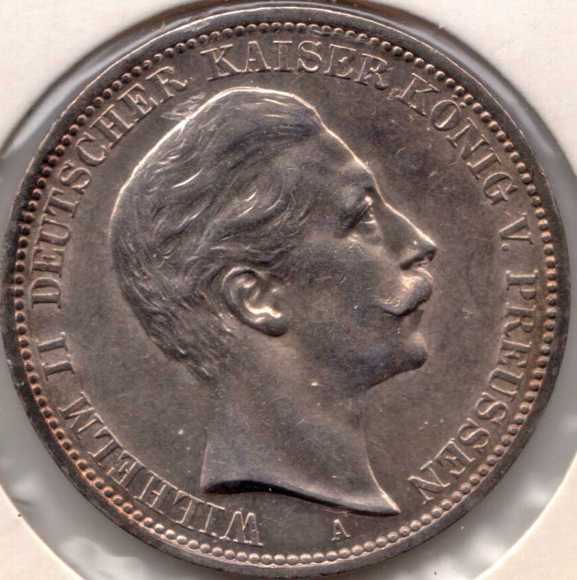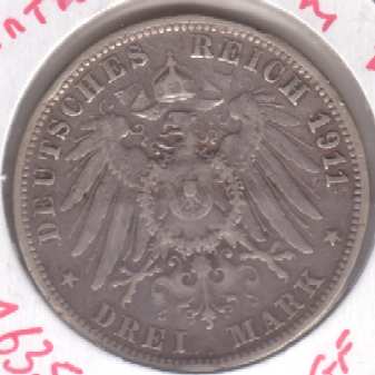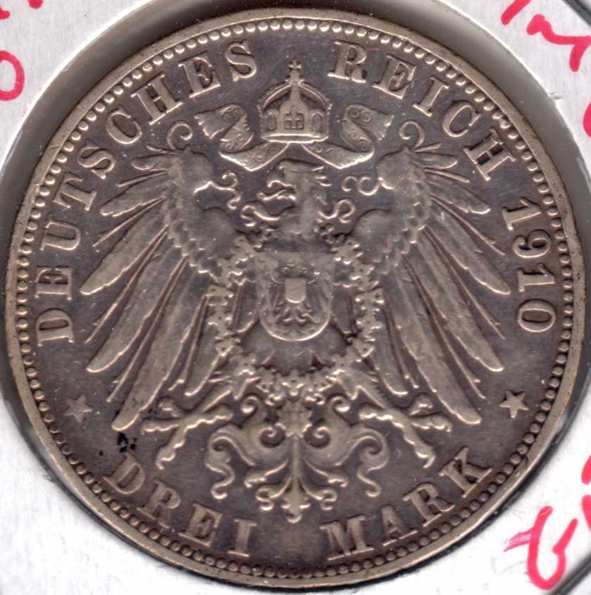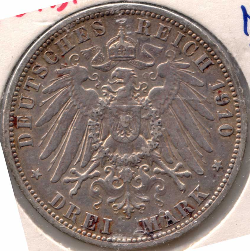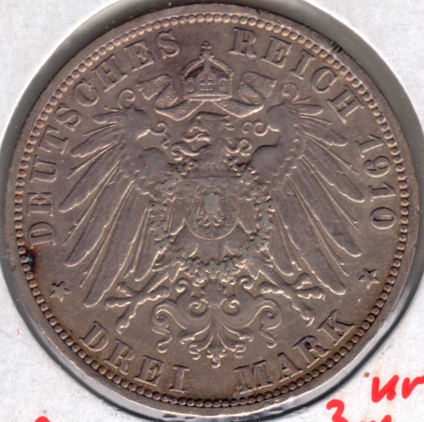 3 Mark (silver) 1910A 52784898.jpg (113653 bytes) 84898x.jpg (99956 bytes) Wilhelm II  some minor toning / stains VF 16.00