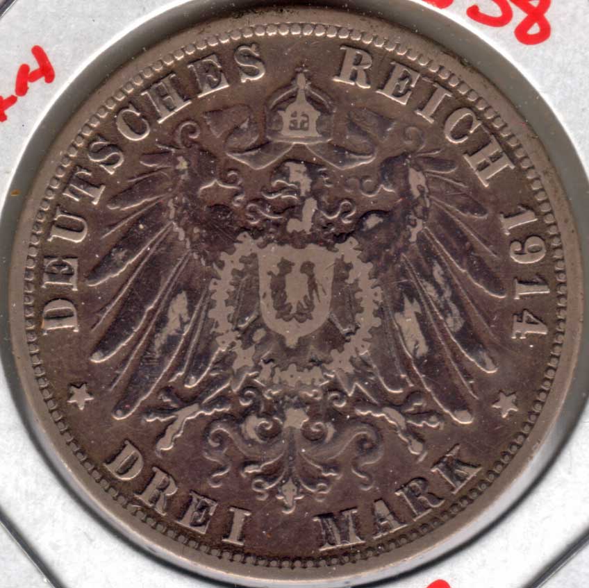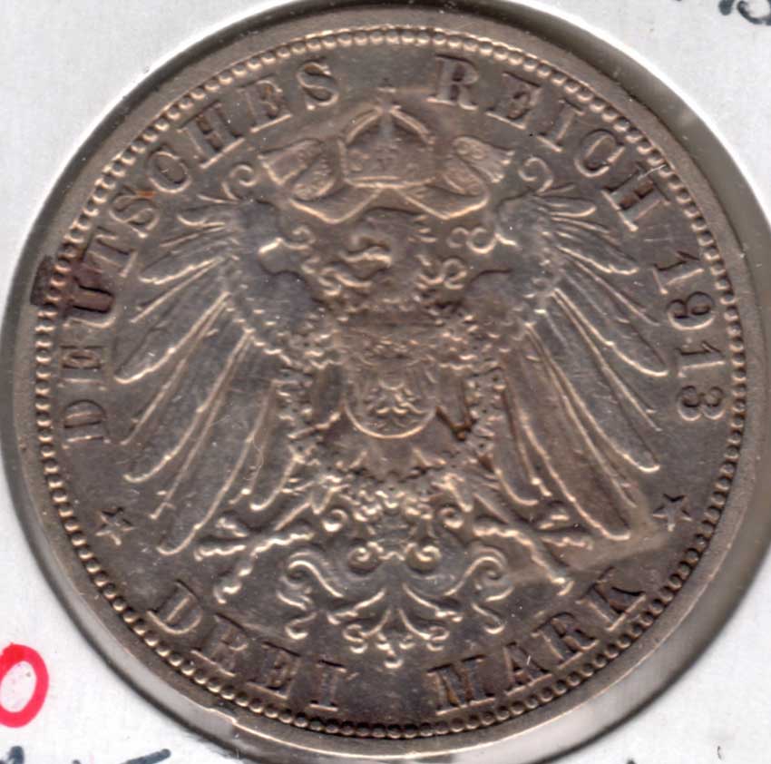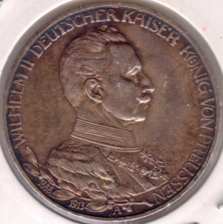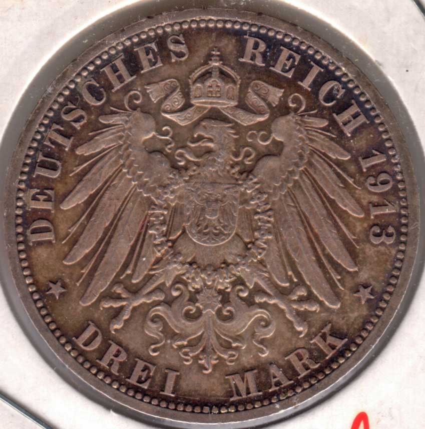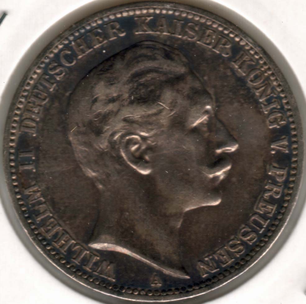3 Mark (silver) 1910A 52784898.jpg (113653 bytes) 84898x.jpg (99956 bytes) Wilhelm II  some minor toning / stains VF 16.00