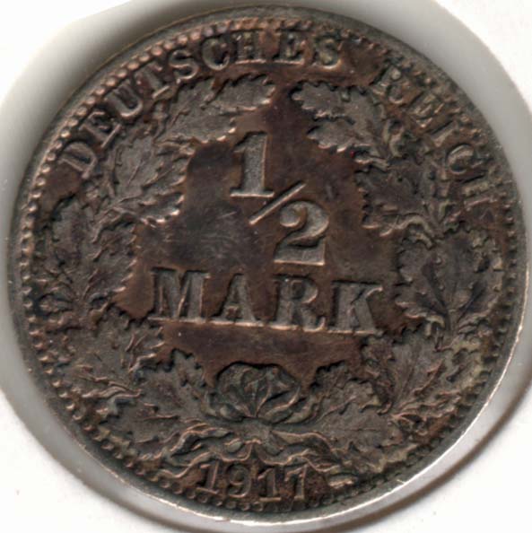 ½ Mark (silver) 1917A 17 ger99631.jpg (56106 bytes) ger99631x.jpg (60205 bytes) old clean AEF 2.00
