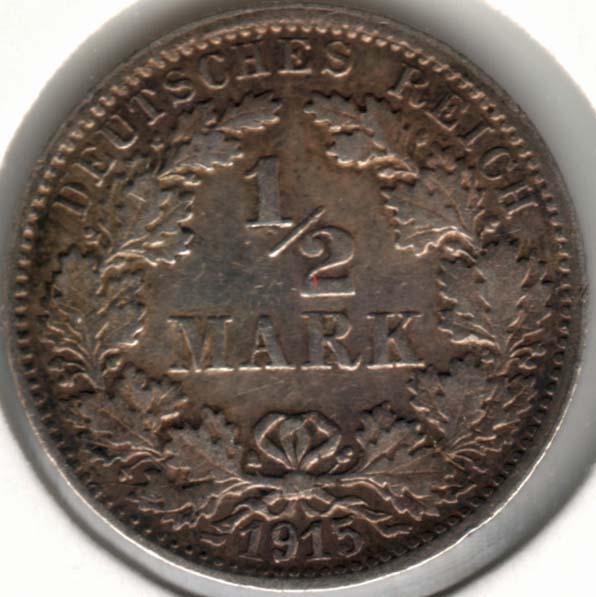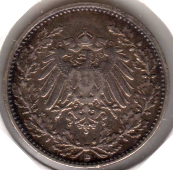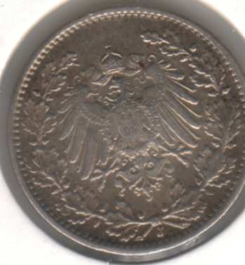 ½ Mark (silver) 1917D 17 ger8hu.jpg (61764 bytes) ger8hux.jpg (55281 bytes)   VF 2.50