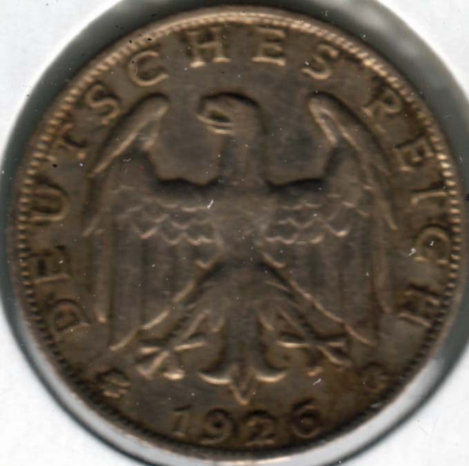 1 Reichmark (silver) 1926A 44 g4pu.jpg (70577 bytes) g4pux.jpg (56955 bytes) toned F/GF 4.24