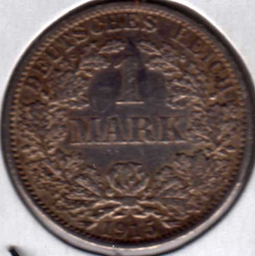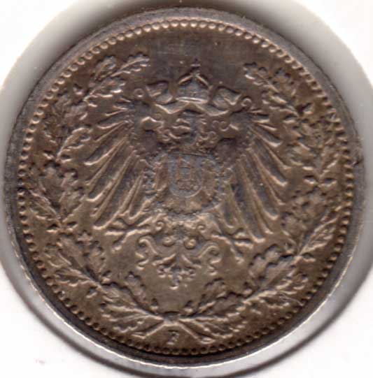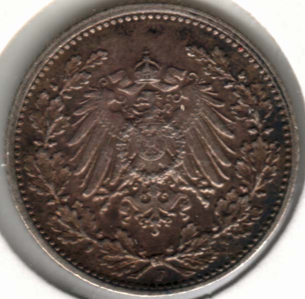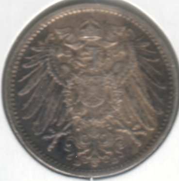 1 Mark (silver) 1914A 14 germany1mark1914xf.jpg (16093 bytes) germany1mark1914xfx.jpg (12748 bytes) Obv light tone/Rev dark tone GEF 6.00