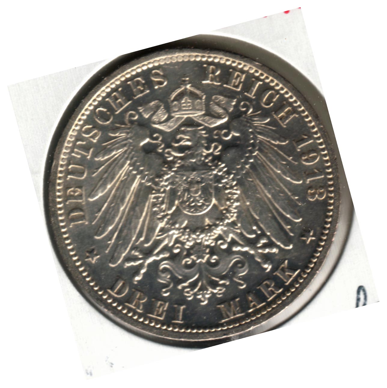 2 Mark (silver) 1913A 533 ger7t4.jpg (63394 bytes)  ger7t4x.jpg (63862 bytes) Wilhelm II 25th Year of Reign   Rev Gem UNC prooflike  Obv Gem AU++ Gem AU/UNC 30.00