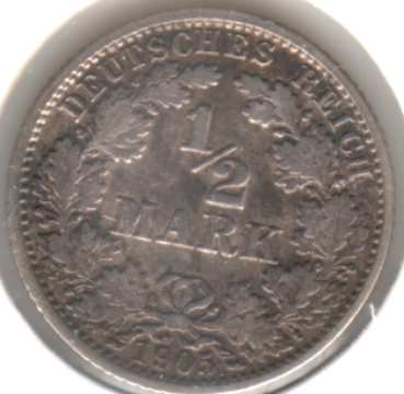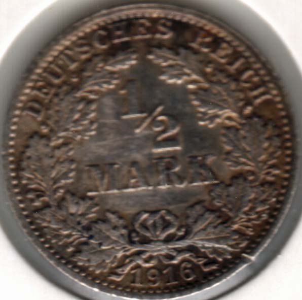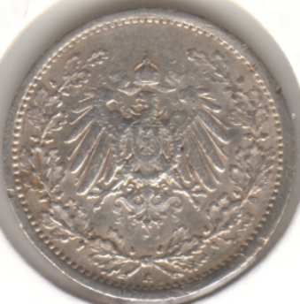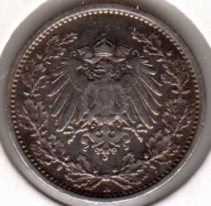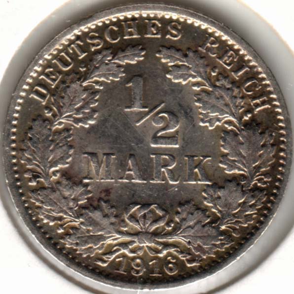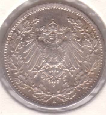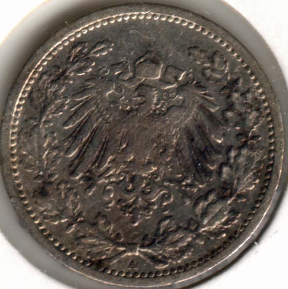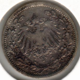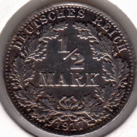 ½ Mark (silver) 1917A 17 ger003.jpg (12276 bytes) ger003x.jpg (17555 bytes)  some lustre   better than photos show AU 8.00