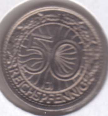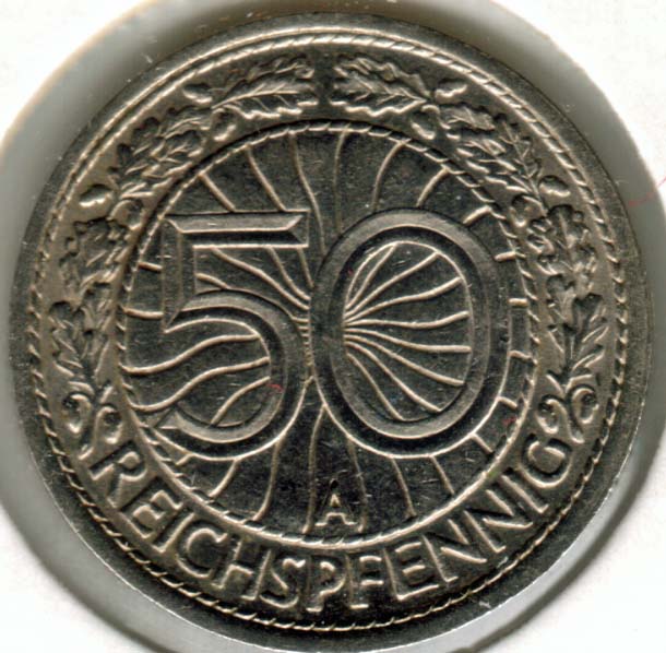 50 Reichspfennig 1936A 49 ger35ub.jpg (96364 bytes) ger35ubx.jpg (87138 bytes)   AEF 5.00