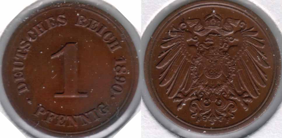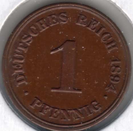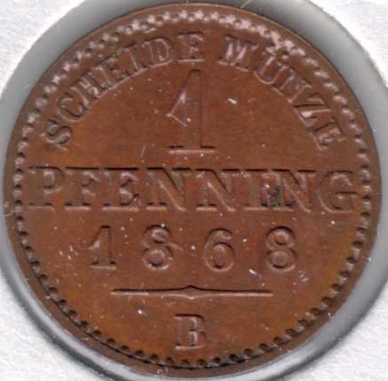 1 Pfennig 1868B 480  ger4ccc.jpg (45840 bytes) ger4cccx.jpg (42585 bytes) trace of lustre very minor scratches by N in pfennig AU 9.00
