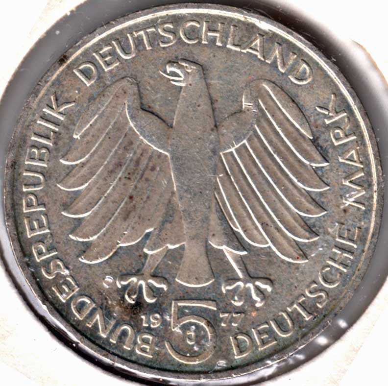 5 Mark (silver) 1977J 145 ger5ab5.jpg (113929 bytes) ger5ab5x.jpg (82337 bytes) 200th ann Birth of Carl Friedrich Guass        proof issue but mishandled AU 5.00