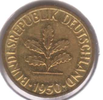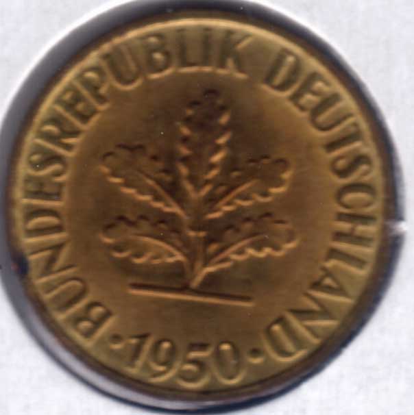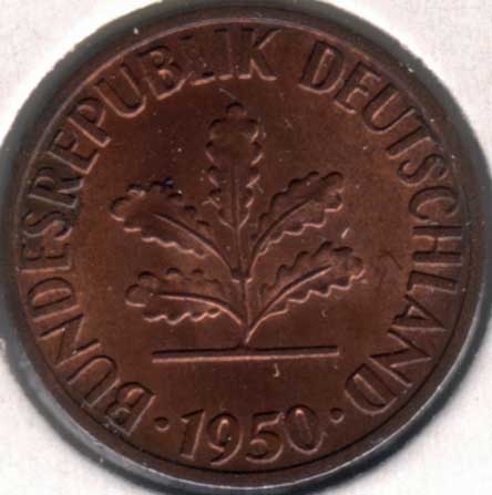 1 Pfennig 1950F 105 gp42.jpg (42029 bytes) gp42x.jpg (42866 bytes)  97% lustre minor dark spot/patch UNC 0.75