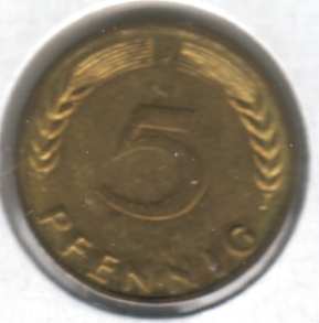 5 Pfennig 1950J 107 ger5pf50.jpg (12269 bytes) ger5pf50x.jpg (7204 bytes) small J     70% lustre Gem UNC 5.00