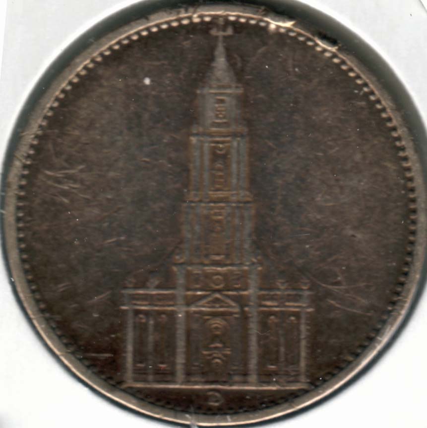 5 Reichsmark (silver) 1934D 83 ger5ub.jpg (97242 bytes) ger5ubx.jpg (75082 bytes) Potsdam Garrison Church   two minor edge knocks VF 10.00