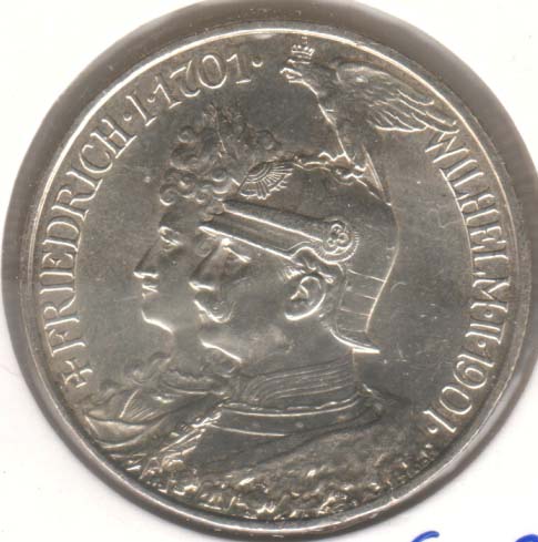 2 Mark (silver) 1901A 525 ger7t8.jpg (77944 bytes) ger7t8x.jpg (63113 bytes) 200 Years Kingdom of Prussia Choice AU 24.00