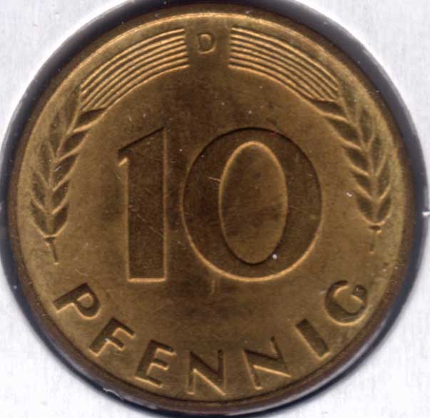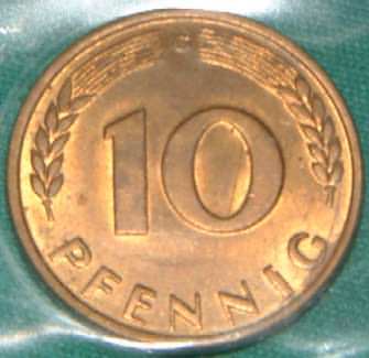 10 Pfennig 1950D 108 v43a.jpg (55731 bytes) v43ax.jpg (45176 bytes) 99.99% lustre   Very minor dark spot on rim Gem UNC 2.75
