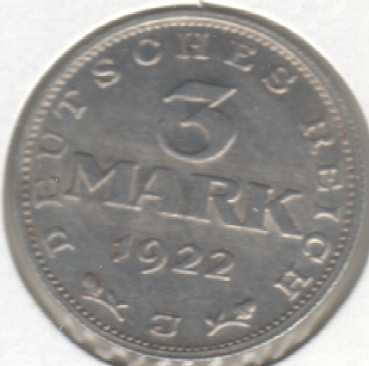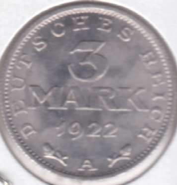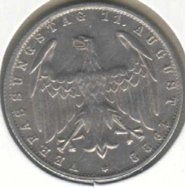 3 Mark 1922J 29 zz56.jpg (14876 bytes) zz56x.jpg (11495 bytes) 3rd Anniversary Weimar Constitution   minor spot AU 4.00