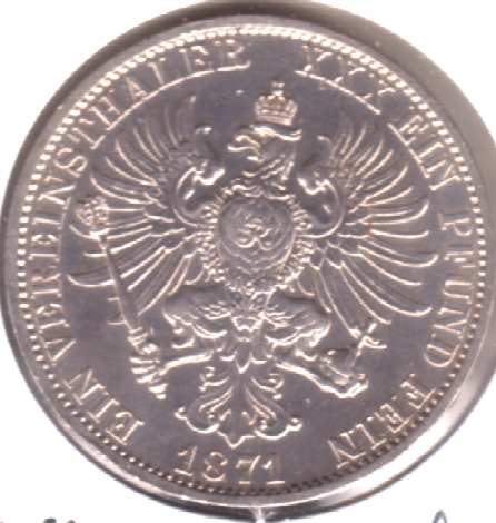 1 Thaler (silver) 1871A 494 prussia71km494.jpg (27655 bytes)  prussia71km494x.jpg (22196 bytes)   GVF 35.00sold