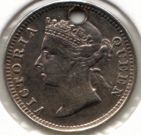 5 Cents (silver) 1888 10 ss071.jpg (58644 bytes) ss071x.jpg (64826 bytes) holed size 2mm dia above bust GVF 12.00