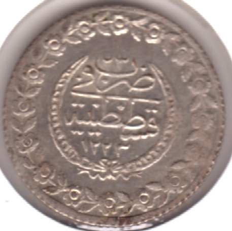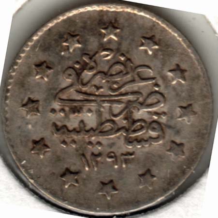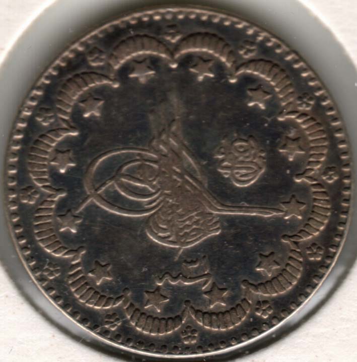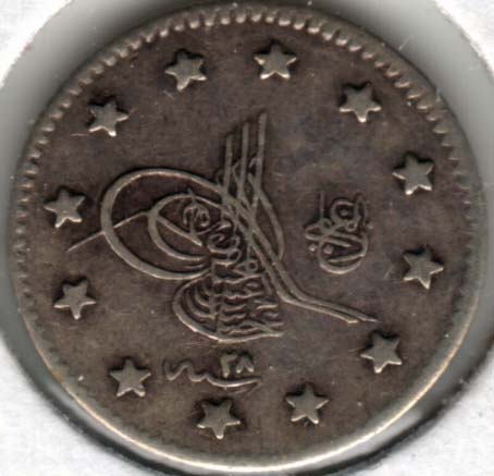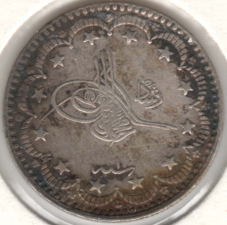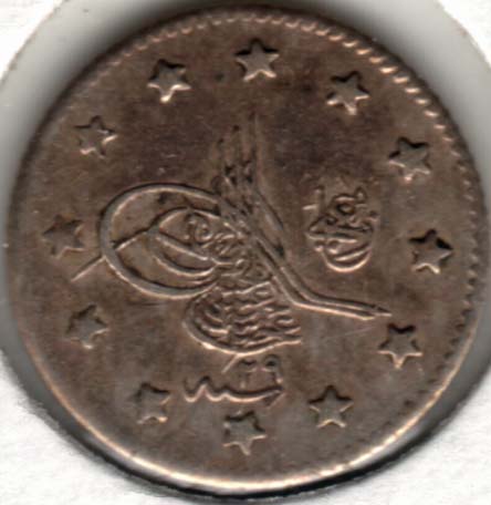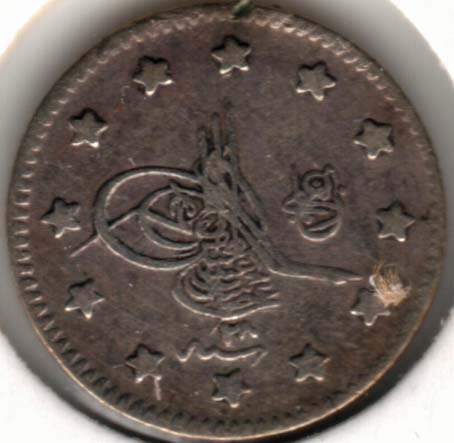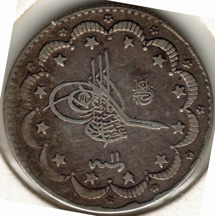 10 Kurush (silver) AH1327 772 turkeykm772y9.jpg (16135 bytes)  turkeykm772y9x.jpg (16720 bytes) year 9 F/GF 12.00sold