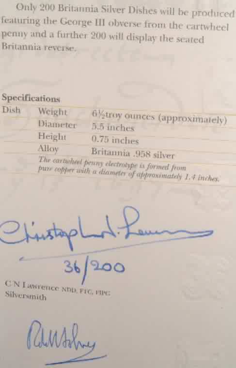 Britannia Silver Dish with Cartwheel Penny 1797 Commemorate 300 years of Britannia Silver and Cartwheel penny 1797.Solid .958 Britannia silver.6.5 Troy ounces Dia 5.5 inches. Royal Mint commissioned Christopher Lawrence to create this dish.Only 200 issued.Cartwheel penny mounted at centre facing.As issued in box of issue with COA (Royal Mint)