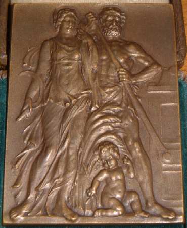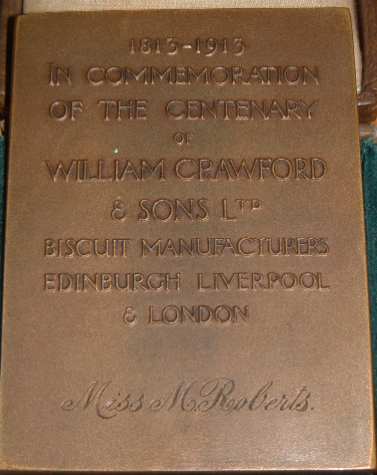 Crawford Biscuits Centenary 1913. Bronze Plaque/medal named to Miss M. Roberts. Obv  Male & Female patrons of industry with naked child below. Rev  1813 - 1913 In commemoration of the centenary of William Crawford & son's Biscuit Manufacturers. Edinburgh Liverpool London. Art Deco style probably by Pinches. In box of issue (a little shabby) size 50mm x 70mm Bronze