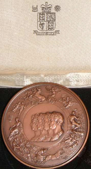 175th Anniversary "Battle of Waterloo" Obv - Busts of King George IV, Francis II of Austria, Alexander I of Russia, Frederick William II of Prussia. Issue by Royal Mint produced from the original Waterloo medal dies that where engraved by Benedetto Pistrucci between 1819-1849.Size 63mm metal .Bronze. In Royalmint box of issue