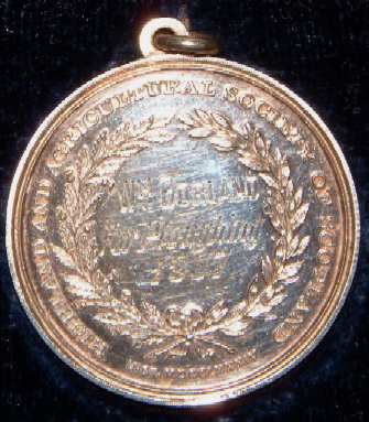 Highland and Agricultural Society of Scotland Prize Medal. A silver medal 1899. A seated female figure upon a dais, places laurel wreaths upon the heads of two standing agricultural workers. Rev. Inscription around a wreath with attribution text within. Peter Fisher "Braes of Ardeonaig" for Blackfaced Tup 1899. Size 45mm   nice tone/colour