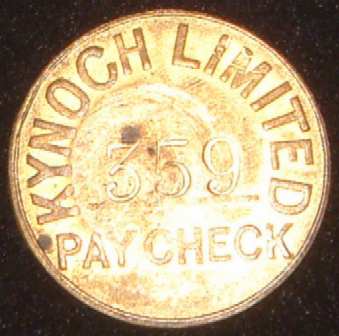 Thames Explosive Works. Pay Check issued by Kynoch Limited # 359 struck in brass ,size 37mm. Embossed with the Kynoch trade mark. (British)